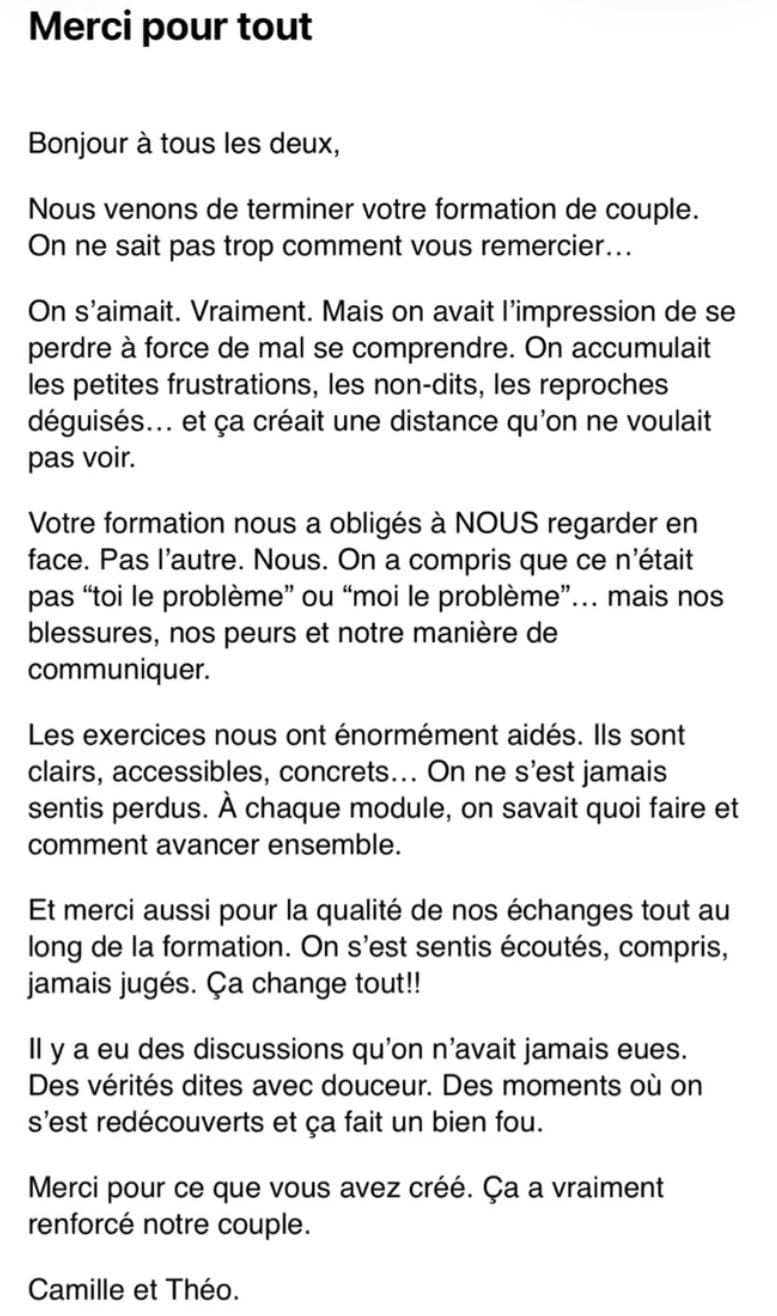 On a décidé de se former, de comprendre nos réactions, nos blessures, nos besoins. Et petit à petit, notre couple s’est apaisé.