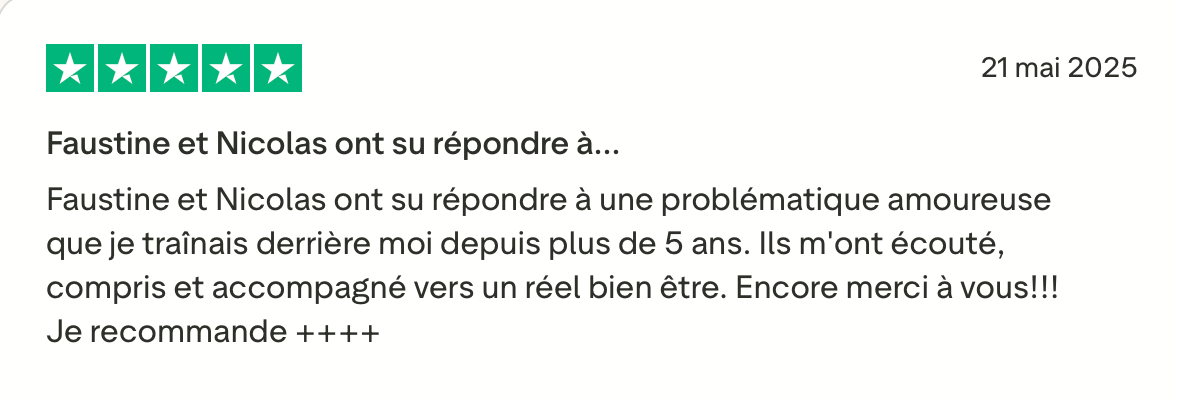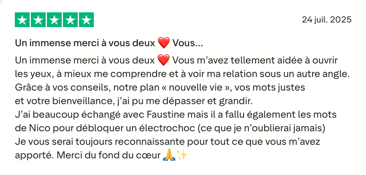 Nous, c’est Faustine & Nicolas, en couple depuis plus de 11 ans et coachs en relation amoureuse.